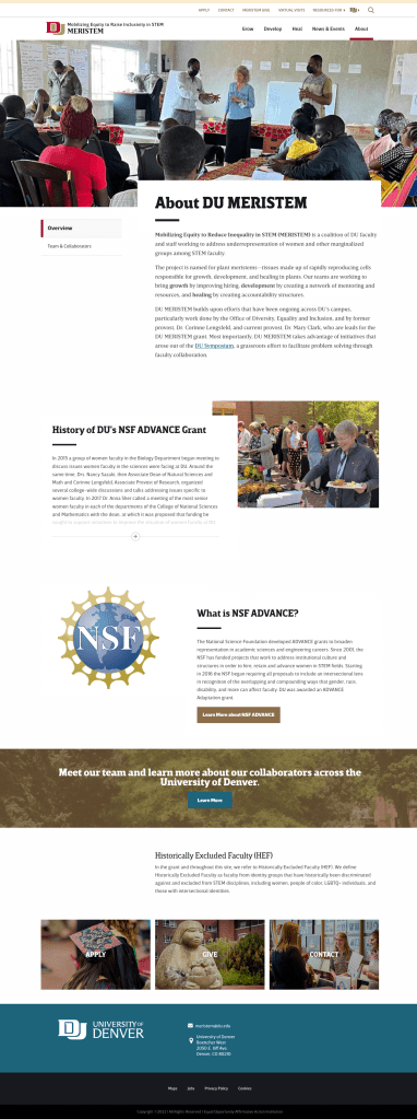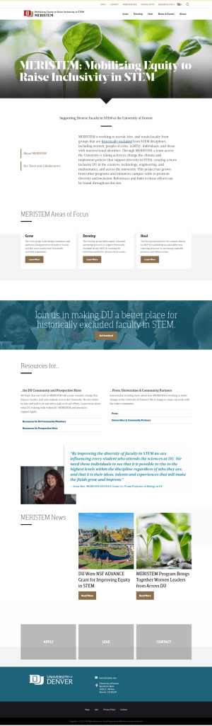 | MERISTEM or Mobilizing Equity to Raise Inclusivity in STEM is the University of Denver’s NSF Advance grant program. The goal is to increase the hiring, retention and of faculty from historically excluded groups, and to improve their experience at the University of Denver by making changes to the campus climate. Projects: |